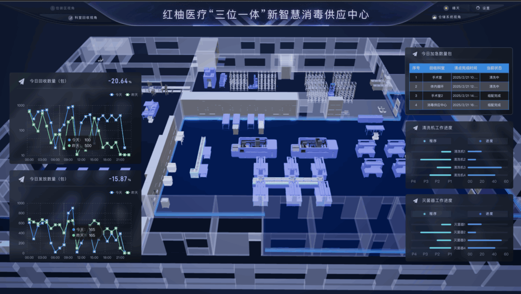 Within the 3D digital environment, customizable overlays display critical CSSD metrics: instrument turnover rate, urgent case ratio, cleaning/sterilization compliance rates, and Overall Equipment Effectiveness (OEE). This delivers a drill-down decision cockpit for department managers, enabling timely and precise operational command.